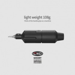 CNC Short Pen Q2 è realizzata in una lega di alluminio di grado aereonautico che la rende una penna per tatuaggio molto leggera e resistente. CNC Short Pen Q2 è molto più silenziosa e vibra molto meno rispetto alle convenzionali macchine per tatuaggio, ma possiede comunque una grande potenze e una battuta regolare e precisa. CNC Short Pen Q2 monta un motore Faulhaber, tedesco e di ultima generazione. Il design del telaio è molto sobrio e semplice, inoltre la forma più corta rispetto alle altre penne tattoo la rende molto maneggevole ed equilibrata. Il motore interno ha uno stroke da 3.5mm standard. Il grip ha un'attacco per cartucce universale e girandolo si può regolare l'escursione dell'ago. RCA standard di alta qualità CNC, Grip da 35mm e oring sostitutivi inclusi nella confezione.